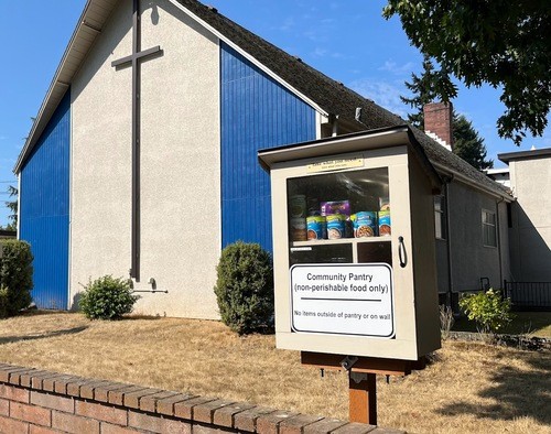 Our community food pantry sits in front of the church and is often mistaken for a neighborhood library. It is regularly stocked by the church, neighbors, and other community members. If you stop by and it is empty and you are in need, please fill out a Connection Card and we will be in contact to see how we can serve you and your family.